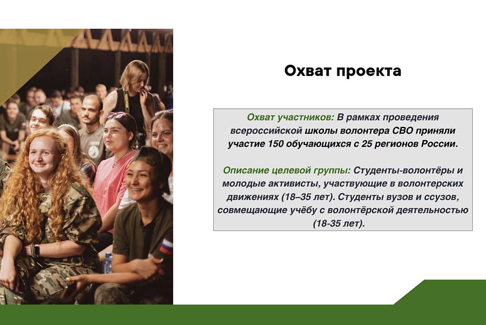 Ключевая цель Школы волонтёра СВО – обучение студентов из разных регионов страны комплексным практическим навыкам по оказанию разносторонней помощи и поддержки демобилизованными военнослужащими СВО и членам их семей, а также мирному населению в условиях чрезвычайных ситуаций.