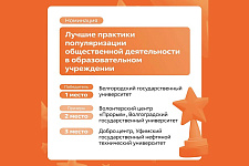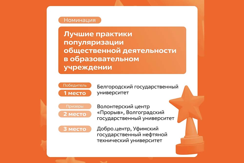 По итогам Всероссийского конкурса лучших практик добровольческой и общественной деятельности в вузах России НИУ «БелГУ» стал победителем в номинации «Лучшие практики популяризации общественной деятельности в образовательном учреждении» с проектом «Всероссийская студенческая школа волонтёра СВО».