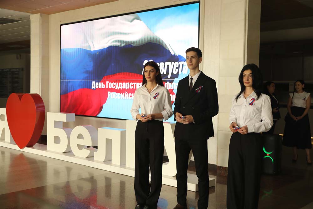 В честь праздника обучающимся и сотрудникам НИУ «БелГУ» на входе в университет сотрудники Департамента молодёжной политики и воспитательной деятельности вуза вручили праздничные ленточки триколора.