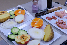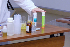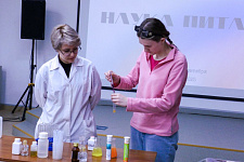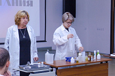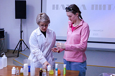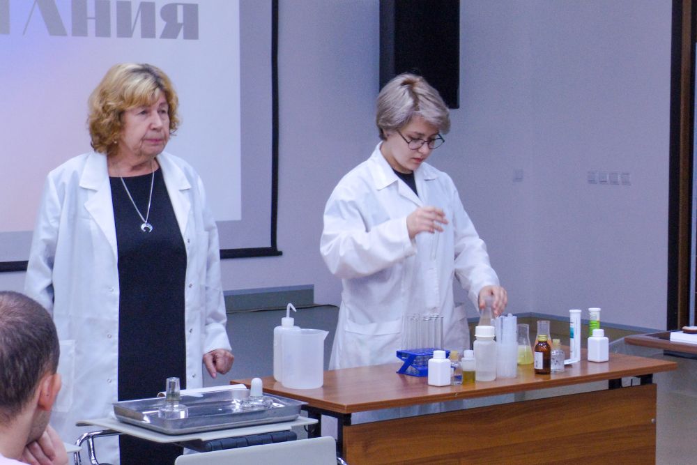 В рамках первого блока команда «Химического десанта» под руководством доцента кафедры общей химии Людмилы Дейнеки продемонстрировала анализ витаминов, лекарственных препаратов, а также продуктов питания, включающих в себя овощи, фрукты и колбасные изделия.