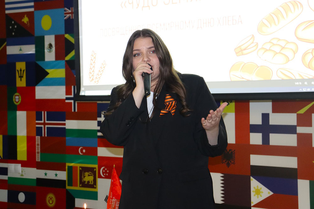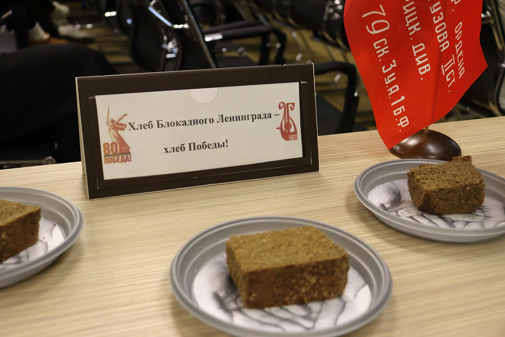 Дань памяти отдали хлебу военного времени. Студенты института фармации химии и биологии НИУ «БелГУ» рассказали о хлебе блокадного Ленинграда, а студентка БГИИиК исполнила песню «Блокада».
