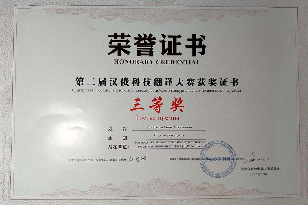 Студент института межкультурной коммуникации и международных отношений НИУ «БелГУ» Антон Солошенко, обучающийся по программе «Перевод и переводоведение» занял третье место во Втором российско-китайском конкурсе на лучший перевод научно-технических текстов.