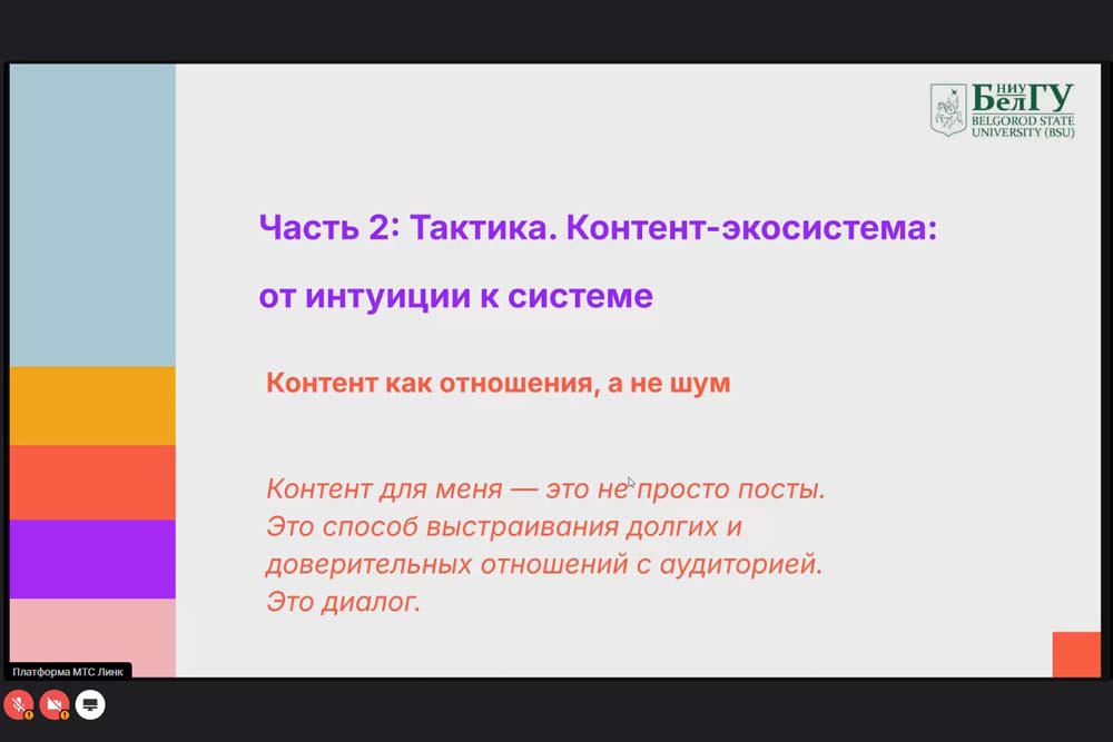 В НИУ «БелГУ» продолжается цикл лекций и мастер-классов от экспертов в рамках двух акселерационных программ «ТехноPRO+» и HealthPRO+, участники которых работают над созданием собственного стартап-проекта. Мероприятия проходят как часть образовательных событий «Университетской среды».