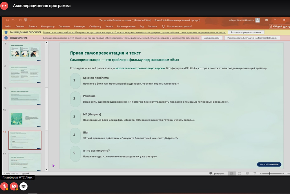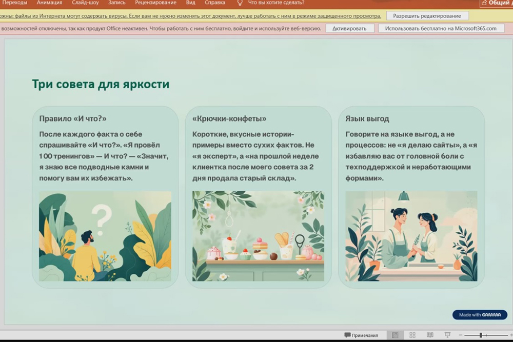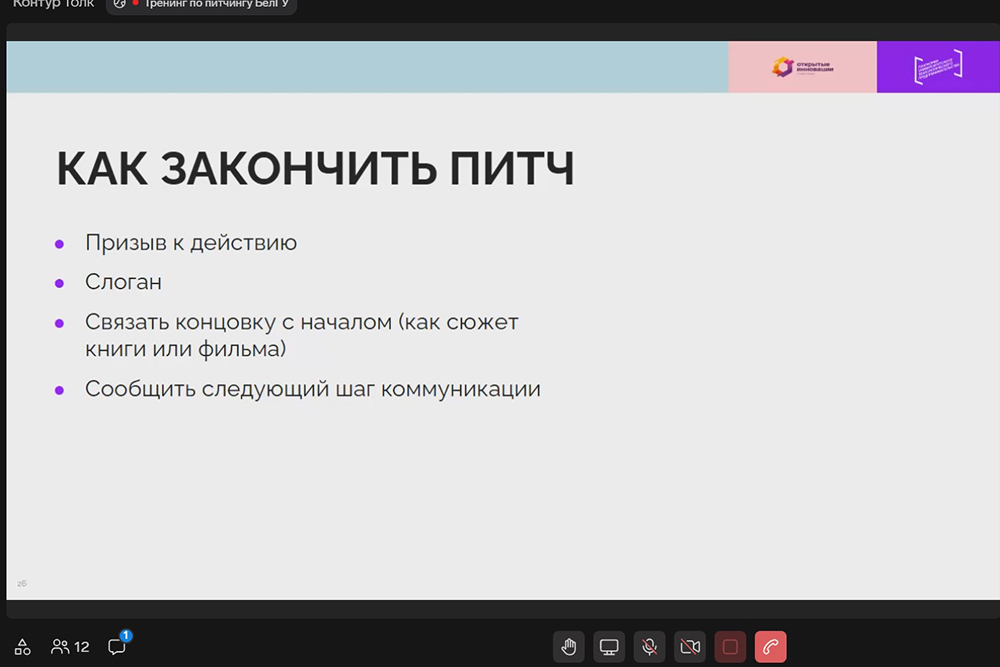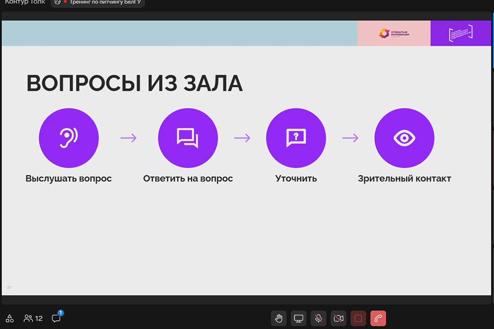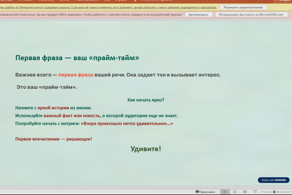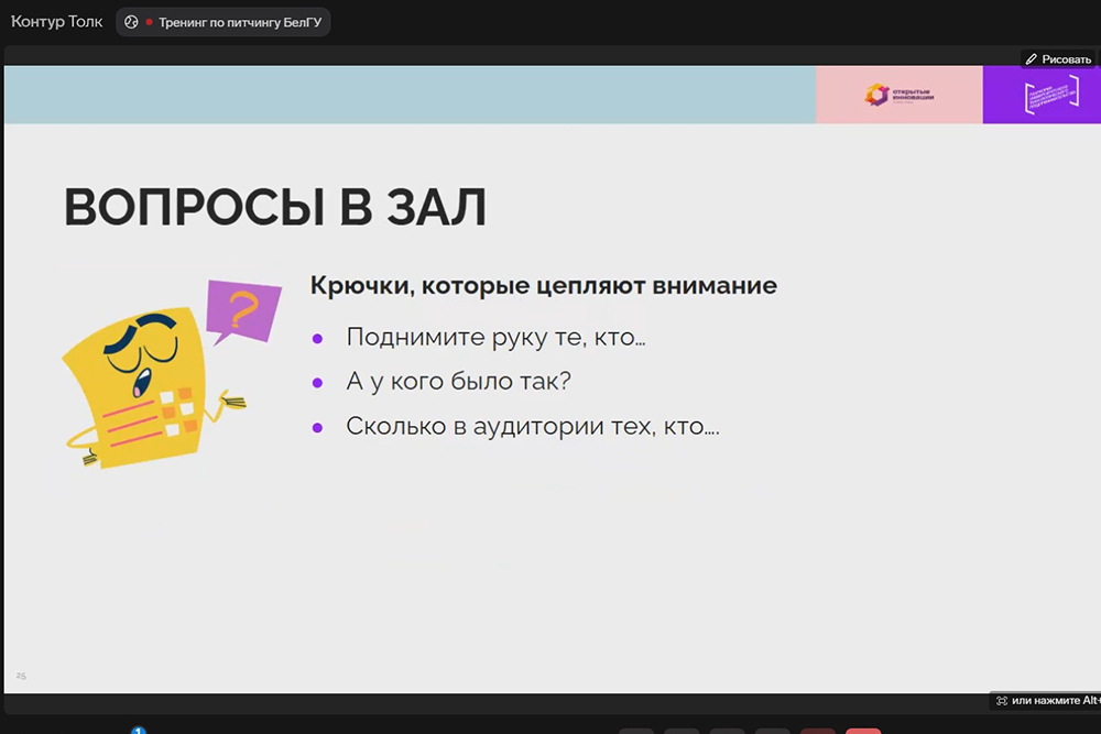 – Важно не только правильно и интересно начать и завершить своё выступление, но и удержать внимание аудитории в процессе. Есть несколько эффективных «крючков», которые позволяют подцепить зрителя и заставить его включиться в ваше повествование. Рассказывайте о личном опыте, делайте подводки к тому, что содержится в вашем проекте. Можно пошутить, но здесь нужно быть осторожным и следить, чтобы юмор был уместным и понятным, – сказала спикер.