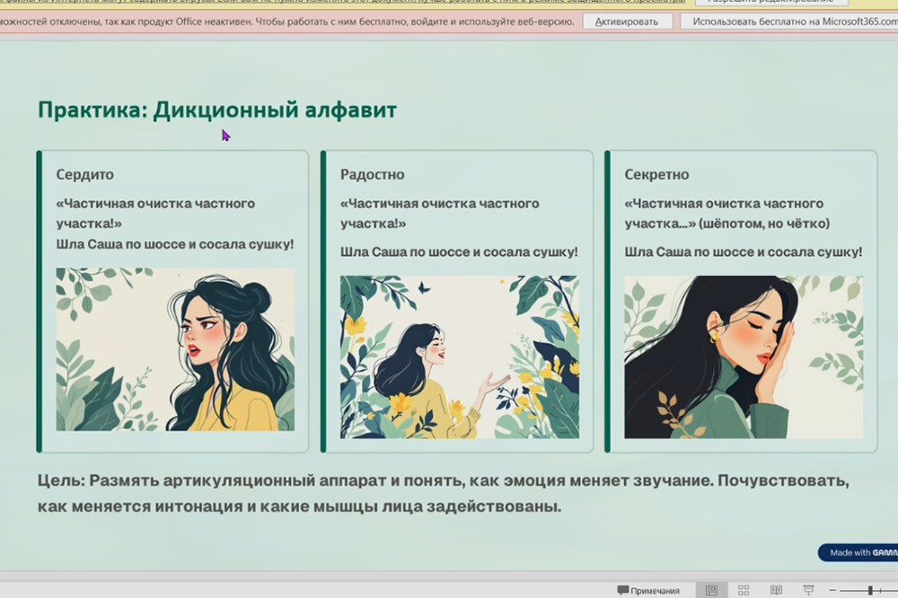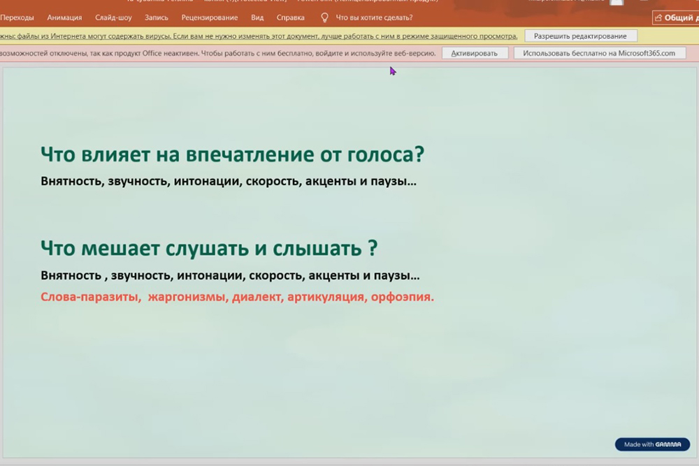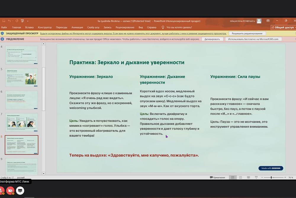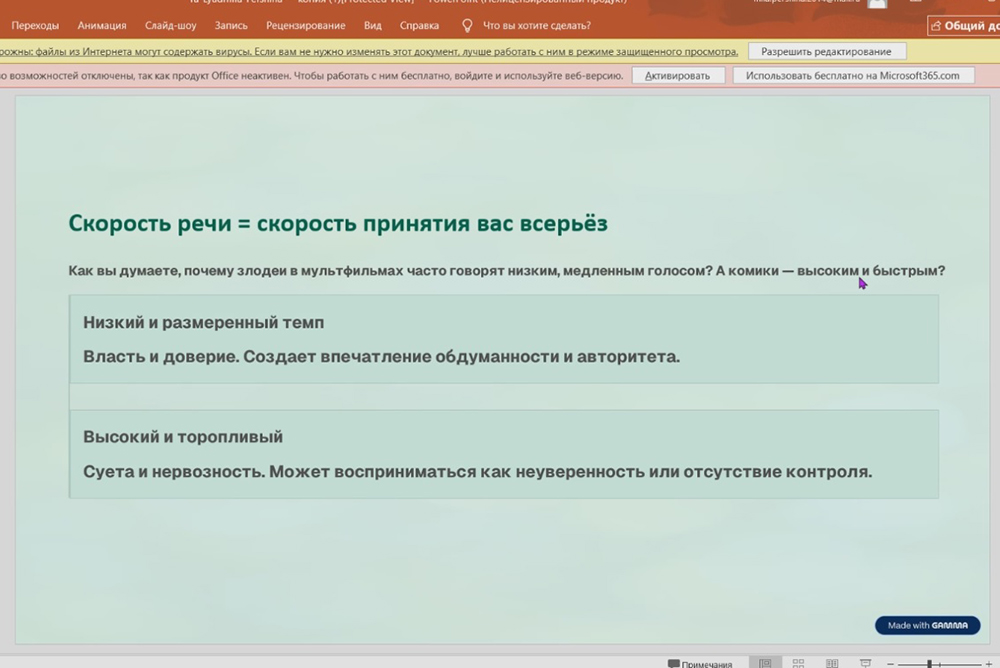 – Следите за своей интонацией и старайтесь говорить более низким голосом, сводя окончание фразы как бы вниз. Обилие высоких звуков подсознательно говорит слушателям о неуверенности говорящего. Такой приём часто используют в комических выступлениях, когда говорят ускоренно и смешным высоким голосом, – пояснила спикер.