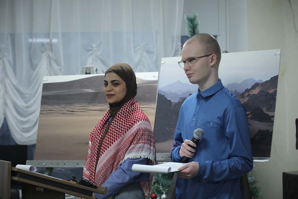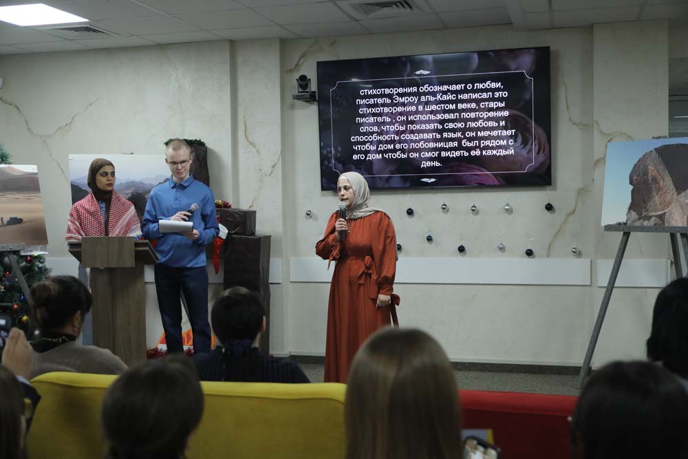 Студенты из стран арабского мира познакомили с историческими, архитектурными, природными достопримечательностями родных стран, исполнили литературные и музыкальные произведения на арабском языке. Гости встречи смогли проверить свои знания в ходе увлекательной викторины и получили призы от автора книг о Сахаре Николая Сологубовского и Центра арабского языка и культуры имени Махмуда Дарвиша.