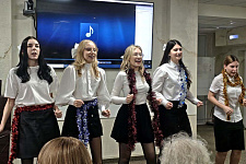 Студенты групп 04002331, 04002431, 04002201 и 04002316 исполнили песни на немецком языке, сопровождая их презентациями и сценками. Также порадовала гостей вечера испанская песня «Hijo de la Luna», мастерски исполненная Екатериной Скляровой. Дуэт Камиллы Казиевой и Анны Бурдасовой из МБОУ «Гимназия №22» продекламировали английское стихотворение «On New Year’s Day». Исполнением песни «Christmas saves the year» рождественское настроение поддержала группа 04002213.