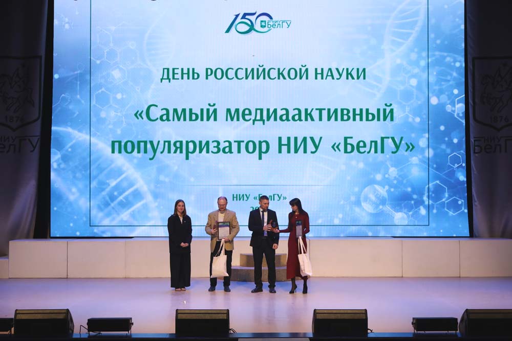 Также на церемонии объявили имена победителей номинации «Самый медиаактивный популяризатор науки в НИУ «БелГУ». Диплом III степени получил профессор Павел Голеусов, который активно популяризирует достижения вуза в области геоэкологии и мониторинга окружающей среды. Диплом II степени вручили кандидату исторических наук Сергею Прокопенко, признанному Всероссийским обществом «Знание» лучшим просветителем Белгородской области и известному активным участием в дискуссиях о фальсификации истории. Диплома I степени удостоен кандидат биологических наук Алексей Дейкин, который в прошедшем году прокомментировал и выступил экспертом в федеральных и региональных СМИ по 25 инфоповодам.