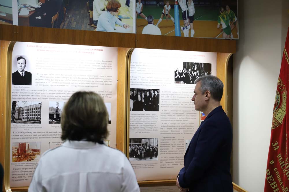 Экспозиция выставки поэтапно представляет периоды жизни Петра Григорьевича, начиная с его детства и юности, которая пришлась на Великую Отечественную войну, и заканчивая его деятельностью в НИУ «БелГУ». Главная часть экспозиции – реконструкция кабинета ректора в период его руководства пединститутом. Выставочный проект рассказывает об истории не только одного человека. Выдающаяся личность Петра Григорьевича стала настоящим проводником в историю всего университета, отражая основные этапы его становления и развития.