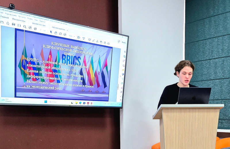 Илья Берестовой (3 курс, заместитель председателя СМИС) затронул одну из самых острых глобальных тем – «Климатическая повестка БРИКС на современном этапе». Он подчеркнул, что страны объединения выступают как единый голос в международной климатической дипломатии с 2011 года, отстаивая принцип дифференцированной ответственности и баланс между экологическими обязательствами и правом на устойчивое экономическое развитие.