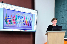 Полина Пехтерева (1 курс, направление «Международные отношения») представила тему «Ключевые культурные инновационные решения в странах БРИКС+». Она рассказала о знаковых проектах объединения в сфере культуры: Международном фестивале театральных школ, Миротворческих эстафетах и Международном культурном форуме «БРИКС о будущем».