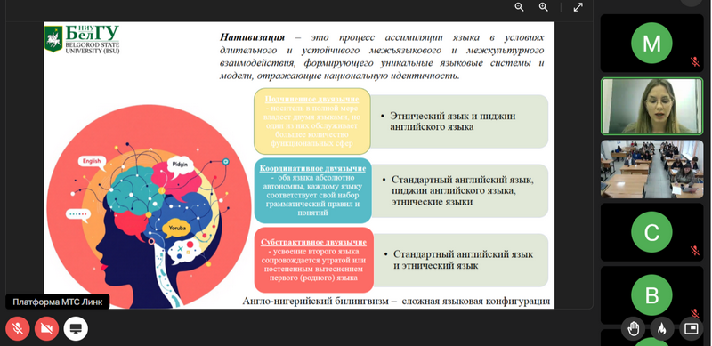 В рамках программы семинара было заслушано шесть докладов, охвативших широкий спектр лингвистических тем. Аспиранты исследовали варианты английского языка в Нигерии и Кении, лингвокультурную специфику, кросс-культурные текстовые модели, а также актуальные вопросы, связанные с большими языковыми моделями и лингвистикой юмора.